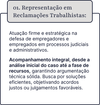 Defesa em casos de desligamentos indevidos, assédio moral ou sexual, revisão de verbas trabalhistas não pagas, horas extras e outros direitos previstos na legislação.”