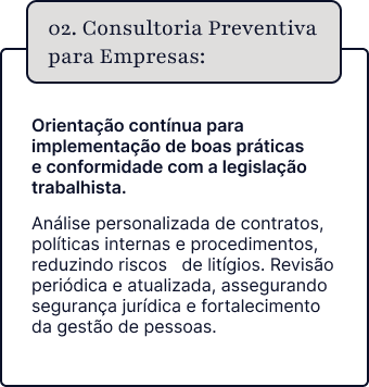 Elaboração de contratos de trabalho, consultoria preventiva, orientação sobre normas de segurança, compliance trabalhista e gestão estratégica de recursos humanos.”