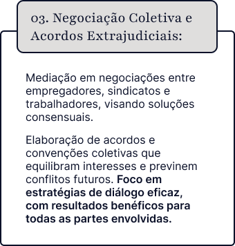 Representação em mesas de negociação, elaboração de acordos coletivos e mediação de conflitos entre empregadores e sindicatos, sempre buscando soluções equilibradas e vantajosas.